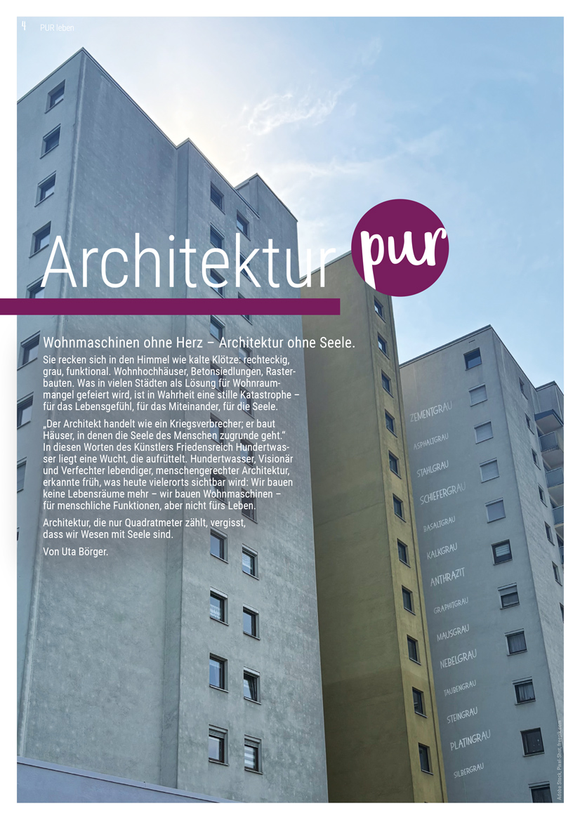 Sie recken sich in den Himmel wie kalte Klötze: rechteckig, grau, funktional. Wohnhochhäuser, Betonsiedlungen, Rasterbauten. Was in vielen Städten als Lösung für Wohnraummangel gefeiert wird, ist in Wahrheit eine stille Katastrophe – für das Lebensgefühl, für das Miteinander, für die Seele. „Der Architekt handelt wie ein Kriegsverbrecher; er baut Häuser, in denen die Seele des Menschen zugrunde geht.“ In diesen Worten des Künstlers Friedensreich Hundertwasser liegt eine Wucht, die aufrüttelt. Von Uta Börger.
